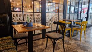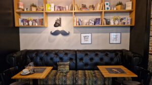 KaFFeine je zariadená v modernom industriálnom štýle, ktorý kombinuje surové materiály, ako sú kov a drevo, s jemnými detailmi, ktoré priestoru dodávajú útulnosť. Interiér sa skladá z dvoch častí – nefajčiarskej a fajčiarskej. Nefajčiarska časť je s pohodlnými koženými lavicami, ktoré sú zdobené výrazným prešívaním a drevenými stolmi. Na stenách sú viditeľné police plné kníh a dekorácií, ktoré vytvárajú pocit, akoby ste boli v obývačke niekoho, kto miluje literatúru a dizajn. Zaujali nás aj obrázky na stenách, ktoré dopĺňajú celkovú atmosféru. Nad stolmi visia retro svietidlá, ktoré vytvárajú jemné a teplé osvetlenie. Celý interiér pôsobí harmonicky, pričom industriálny štýl je oživený drobnými farebnými akcentmi, ako sú žlté stoličky. Fajčiarska časť je rovnako štýlová. Je oddelená presklenou stenou s kovovými rámami, čo dáva priestoru určitú vzdušnosť. V tejto časti nájdete tiež pohodlné stoličky a menšie stolíky, ideálne na krátke posedenie. Podlaha kaviarne je pokrytá mozaikou z dlaždíc s rôznymi vzormi, čo dodáva priestoru dynamiku a vizuálnu príťažlivosť.