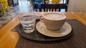 KaFFeine ponúka široký výber nápojov a jedál, ktoré uspokoja rôznorodé chute zákazníkov. Kaviareň ponúka klasické espresso, espresso macchiato, cappuccino, caffè latte a flat white. Pre milovníkov špeciálnych chutí sú v ponuke aj kávové varianty s príchuťami ako čokoláda, karamel či vanilka. Okrem toho si môžete vybrať bezkofeínovú kávu alebo tureckú kávu. Pre letné dni majú v ponuke studené nápoje ako inverse cold cappuccino. V menu nájdete rôzne sypané čaje, čerstvú mätu so zázvorom a horúcu čokoládu, ktorú si môžete doplniť šľahačkou. Z nealkoholických nápojov si môžete vychutnať domáce malinovky, čerstvé džúsy, minerálky a rôzne limonády. Pre milovníkov alkoholu sú v ponuke kvalitné whisky, rumy, brandy, vína na pohár či prosecco. KaFFeine ponúka aj pestrý výber dezertov, ktoré sú vystavené vo vitríne pri bare. K dispozícii sú čerstvé zákusky, koláče a torty, ktoré lákajú svojím vzhľadom aj vôňou. Pri našej návšteve sme videli napríklad čokoládovú tortu a ovocný cheesecake. Pri našej návšteve sme si objednali cappuccino, ktoré nás potešilo nielen chuťou, ale aj spôsobom servírovania. Nápoj bol podávaný v elegantnej keramickej šálke na bielom podšálku, pričom celkový dojem dotváral malý pohár vody, ktorý je bežnou súčasťou kvalitných kaviarenských zážitkov. Pena bola jemná a krémová, káva mala vyváženú chuť s príjemnou arómou. Obsluha v kaviarni bola príjemná, aj keď miestami pôsobila trochu zaneprázdnene. KaFFeine je rozhodne miesto, ktoré stojí za návštevu. Je to ideálne miesto na posedenie s priateľmi, pracovné stretnutie alebo relax s knihou a šálkou kvalitnej kávy. Ak sa ocitnete v Piešťanoch, určite neváhajte a zastavte sa v KaFFeine.