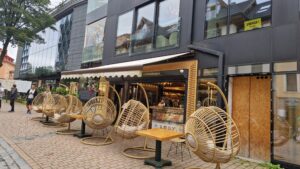 Vonkajšia fasáda kaviarne je dekorovaná čerstvými kvetmi, ktoré dotvárajú jemnú horskú atmosféru miesta. Samotná budova pôsobí luxusným dojmom a je vybavená moderným výťahom, čo pridáva na komforte pre návštevníkov. Po vstupe do interiéru nás hneď obklopila príjemná a útulná atmosféra. Priestor je zariadený v tradičnom goralskom štýle, ale s modernými prvkami. Pohodlné svetlé kreslá a drevené stoly vytvárajú luxusné, no zároveň domácke prostredie. Miestnosť pôsobí teplými tónmi a rôzne detaily, ako sú lampy či výzdoba, len umocňujú pocit, že ste v niečom výnimočnom. Jednou z hlavných atrakcií tejto kaviarne je presklený balkón, ktorý sa tiahne po celom druhom poschodí. Na balkóne nájdete pohodlné ratanové kreslá, v ktorých si môžete vychutnať lahodné jedlá či nápoje, zatiaľ čo sledujete ruch na ulici Krupówki. Ratanové kreslá vytvárajú pohodlné, no zároveň štýlové sedenie, ktoré dokonale zapadá do atmosféry celého podniku. Ak by ste na balkóne nenašli miesto, netreba zúfať – rovnaké ratanové sedenie nájdete aj priamo pred vstupom do kaviarne. Takže ak je balkón plný, môžete si sadnúť vonku a vychutnať si rovnaký zážitok v ešte bližšom kontakte s okolitým dianím.