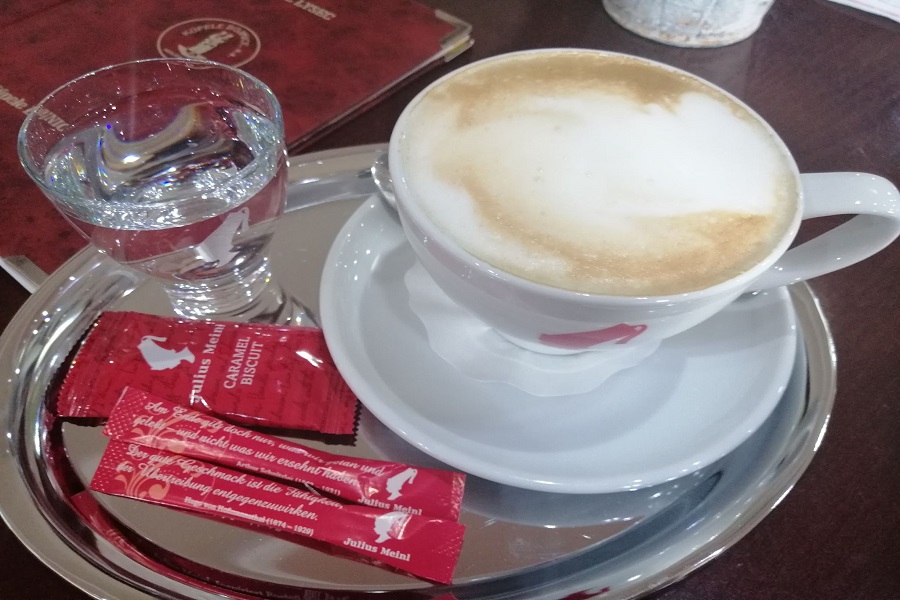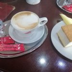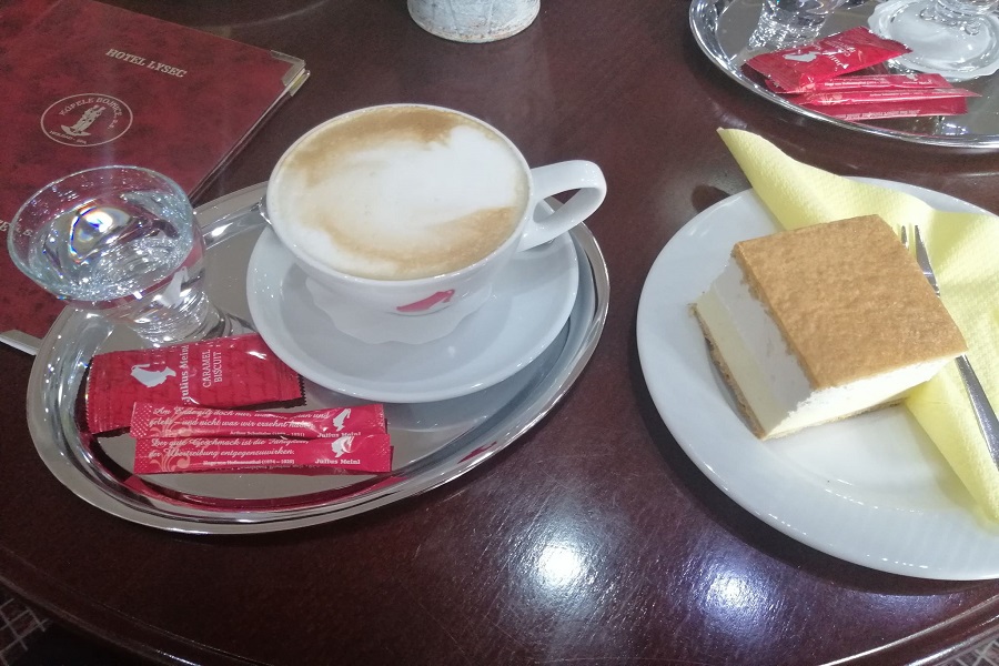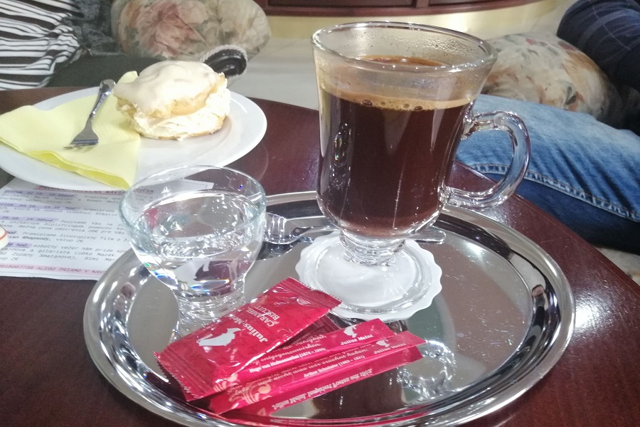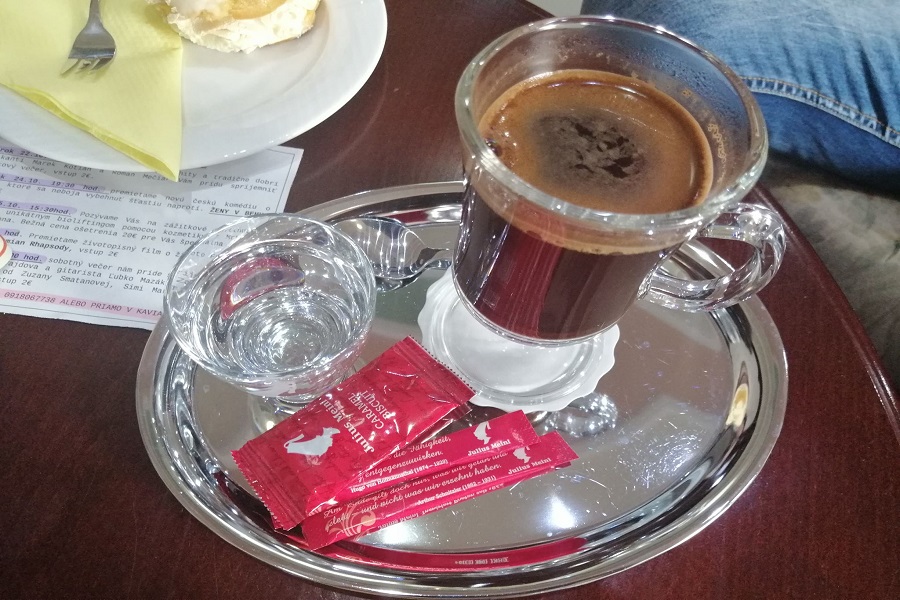 Káva – tak ako som spomínala vyššie, tak my sme si dali capuccino a zalievanú kávu. Taká klasika. Už nás opustilo latte. Ale prešli sme na capuccino. Dlho mi nerobilo dobre to mlieko, ktoré nie vždy bolo dobre vyšľahané. A tak som prešla hoci stále na kávu s mliekom, ale je tam toho menej. Moje telo si normálne muselo zvykať na kofeín. Aspoň vidím ten rozdiel. Ale potrebovala som to, aby som sa trošku prebrala konečne ráno. A toto capuccino bolo skutočne dobré. Pena bola taká skôr redšia, ale to nebralo na chuti. Chuťovo to bolo fakt dobré a ako bolo cítiť aj horkosť. Samozrejme sme ku káve dostali cukor a vodu.
