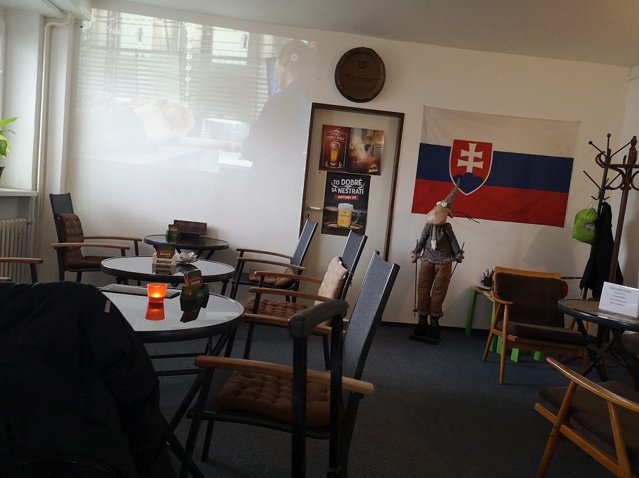 Kým káva dorazila, krátili sme si čas pozeraním telky. Televízny program premietali na stenu. Takéto rozptýlenie je fajn, keď vám rýchlik mešká hodiny (púšťali seriály), ale rušivejšie, keď sa chcete dôverne rozprávať. Tento televízny prvok má pravdepodobne viac fanúšikov počas zápasov, čomu nasvedčovala aj obrovská vlajka vedľa na stene.