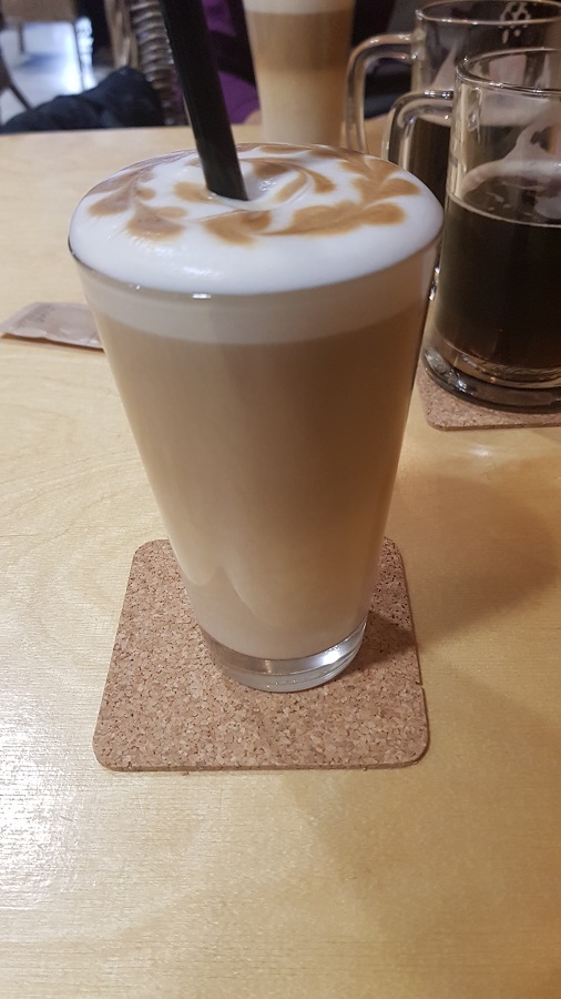 Keď som po dlhom zvažovaní či ísť do tejto kaviarne alebo nie, prišla k záveru, že konečne tu idem nevedela som kam sa mám ísť posadiť, kde sa pozerať prv. Veľmi ma zaujala táto kaviareň výzorovo. Na stenách môžete vidieť povešané staré bicykle, nájdete tu aj knihy, ktoré si môžete prečítať. Nápojový lístok ma tiež veľmi zaujal. Na každom stole som si ešte všimla, že sa nachádza týždenne obedové menu. Obsluha mi hneď s úsmevom doniesla nápojový lístok a ja som najprv nevedela, že čo si mám vybrať. Tak nakoniec som zvolila klasiku latte macciato a kofolu k tomu. Kávu som dostala veľmi rýchlo. Na pene bol nakreslený aj obrázok, čo málo kde robia. Pohár vody som ku káve nedostala. Káva bola veľmi horúca, nedala sa hneď piť. Ku káve som dostala len jeden cukor a nič viac – čo viacerým ľuďom nemusí vyhovovať.