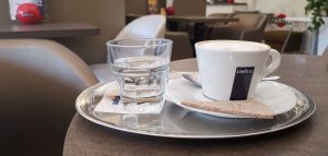 Nakoľko sa kaviareň nachádza v kúpeľnom mestečku, tak za dobrý nápad považujem, že ku káve servírujú trojuholník z kúpeľnej oplátky. Ranné espresso si v tejto kaviarni môžete vychutnať len za 1€, čo isto nejeden zákazník ocení. Trocha ma sklamala obsluha, pretože čašníčky na seba kričali cez celú kaviareň. Pokrikovali si objednávky a rôzne iné informácie, ktoré by sa do ucha zákazníka ani nemali dostať. Kaviarňou sa niesli vety typu „ako sa ten čas vlečie“ alebo „dnes sa mi už nechce“ a podobne. Takéto vystupovanie do reštauračných priestorov rozhodne nepatrí. Aby som však bola objektívna, musím poznamenať, že čašníčka, ktorá obsluhovala náš stôl, bola vcelku príjemná a aj sa usmiala.