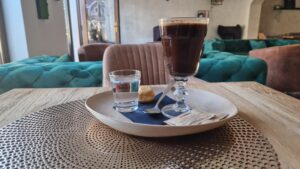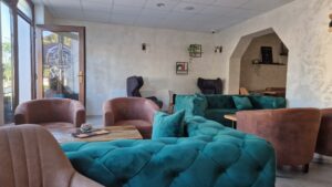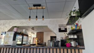 Pred kaviarňou je útulná letná terasa, ktorá je vybavená kovovými stoličkami a stolmi s jednoduchým čiernym dizajnom. Farebné kvetináče s čerstvými kvetmi dotvárajú príjemnú atmosféru a pergola poskytuje tieň, ktorý počas teplých dní dodáva terase ideálne podmienky na oddych. Interiér kaviarne nás zaujal svojou pohodlnosťou a moderným dizajnom. Dominujú mu mäkké kreslá a sedačky v tlmených tónoch fialovej a tyrkysovej, ktoré vytvárajú príjemný kontrast. Steny sú svetlé, s jemnou štruktúrou a minimalistickou výzdobou, pričom priestor pôsobí vzdušne a otvorene. Kaviareň ponúka aj malý detský kútik, ktorý poteší rodiny s deťmi a umožní rodičom si v pokoji vychutnať šálku kávy.