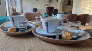 Ponuka kaviarne je pestrá. Medzi nápojmi nájdete rôzne druhy kávy od klasického espressa, cez cappuccino, až po zalievanú kávu. K dispozícii sú tiež osviežujúce nealkoholické nápoje ako limonády, džúsy, minerálky či obľúbené sýtené nápoje. Okrem toho ponúkajú aj dezerty, ktoré sú ideálnym doplnkom k šálke kávy. Na jednoduché a rýchle občerstvenie majú v ponuke polotovarovú pizzu, ktorá je chutnou voľbou pre hladných návštevníkov. My sme si objednali cappuccino a zalievanú kávu. Obe boli krásne servírované na keramických tanierikoch s pohárom vody a malým pečivom, čo pridalo na celkovom zážitku. Cappuccino malo bohatú krémovú penu a jeho chuť bola jemná a vyvážená. Zalievaná káva bola silná a aromatická, ideálna pre milovníkov tradičnej kávy. Kaviareň podáva kávu značky Molinari, ktorá má bohatú históriu. Značka vznikla v roku 1804 v talianskom meste Modena a dodnes je synonymom kvality a výnimočnej chuti. Spoločnosť Molinari spája tradičné metódy praženia kávy s modernými technológiami, čo zaručuje jedinečný chuťový zážitok. Naša návšteva v kaviarni Sarah bola sprevádzaná vynikajúcou obsluhou. Celková atmosféra kaviarne bola príjemná a určite ju odporúčame každému, kto zavíta objavovať históriu do Čachtíc.