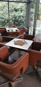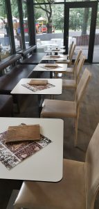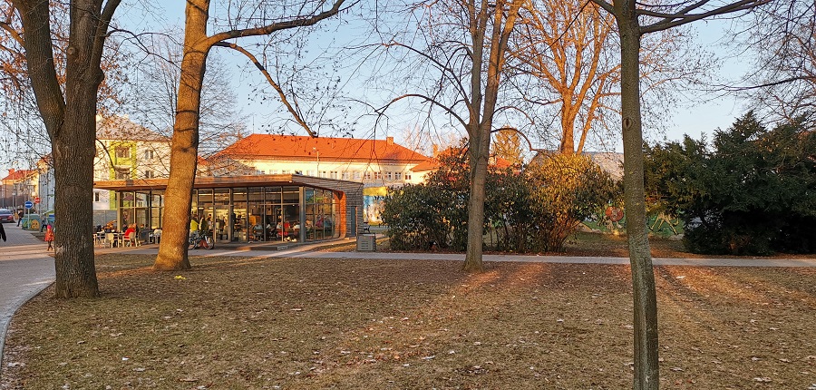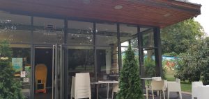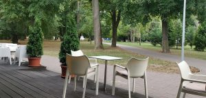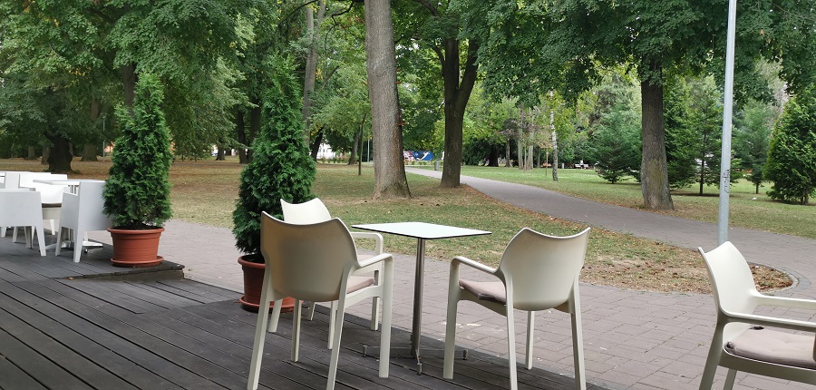 Aj keby sa mohlo zdať, že zákazníkmi kaviarne sú najčastejšie rodičia s malými deťmi, zariadenie je vhodné aj na stretnutia s priateľmi alebo na obchodné schôdzky. Budova kaviarne je obložená smrekovcovým obkladom a strecha je rovná. Kaviareň je menšia – pre predstavu, zastavaná plocha je 152 metrov štvorcových. Sedenie v interiéri je riešené formou lavice a koženými bielymi stoličkami. Na druhej strane miestnosti nájdete čokoládovohnedé kreslá, ktoré sú pohodlnejšie, a to nie len na pohľad. Prestieranie na stole pozostávalo zo servítky s rôznym motívom, čo považujem za celkom praktický nápad, ktorý neurazí a na druhej strane ani extra neohúri. Na každom stole nájdete aj ponukový lístok. Cez trojstranné presklenie môžete sledovať dianie v parku. Kaviareň disponuje terasou, ktorá je zariadená strohými bielymi stoličkami. Prepojenie terasy s detským ihriskom napĺňa priestor životom.