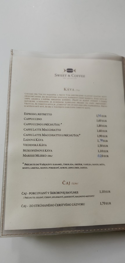 Kaviareň Sweet & Coffee sme už navštívili viackrát a vždy sme boli spokojní. Radi si tu objednávame cappuccino, ktoré má veľmi prijateľnú cenu 1,60€. Cappuccino v tejto kaviarni je lahodné. Servírujú vlastnú značku kávy SWEET & COFFEE, ktorej receptúru zostavil popredný český barista. Jedná sa o 100% Arabicu s nižším obsahom kofeínu. Kávu im pražia každý týždeň v susednej Českej republike a následne im ju zasielajú kuriérom. V tejto kaviarni si dávajú záležať na tom, aby zákazníkovi ponúkli vždy čerstvú kávu. To sa očividne odráža aj na kvalite kávy. Samozrejme, všetky kávy ponúkajú aj v bezkofeínovom prevedení. Ak máte chuť si svoju kávu ozvláštniť, môžete si zvoliť rôzne príchute ako sú napríklad vanilka, oriešok, čokoláda, karamel, kokos, lesná zmes, jahoda, mango, kokos, mojito, limetka, banán. V ponuke majú okrem kávových nápojov, alkoholických a nealkoholických nápojov aj prvotriedne dezerty vlastnej výroby. Personál v kaviarni je milý a ochotný. Keď opäť pôjdem cez Hurbanove sady, určite ochutnám ich belgickú čokoládu so šľahačkou, nakoľko podľa slov iných zákazníkov je najlepšia, akú kedy ochutnali.