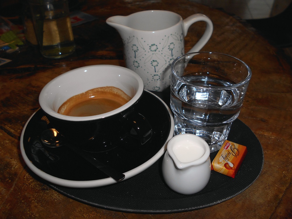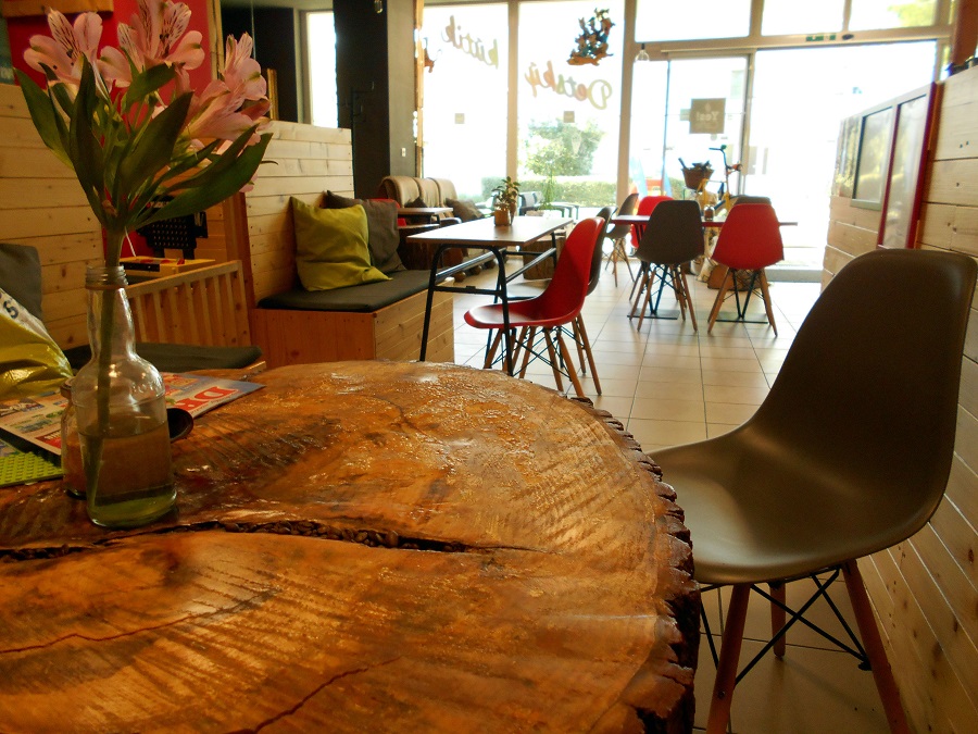 Usadili sme sa na miesto, kde klasický stôl nebol a kávu nám čašník postavil na odpílený klát. Môžeme tipovať koľko rokov strom rástol, kým vyrástol do takého obrovského priemeru kmeňa. Praskliny sú vyplnené zrnkami kávy a deti ich odtiaľ s radosťou vyberajú. Veľmi zaujímavé, ale nepraktické. Sedí sa nepohodlne, lebo nohy sa nemôžu dať pod stôl. Do kaviarne sa dá dostať aj s kočíkom, má bezbarierový prístup.