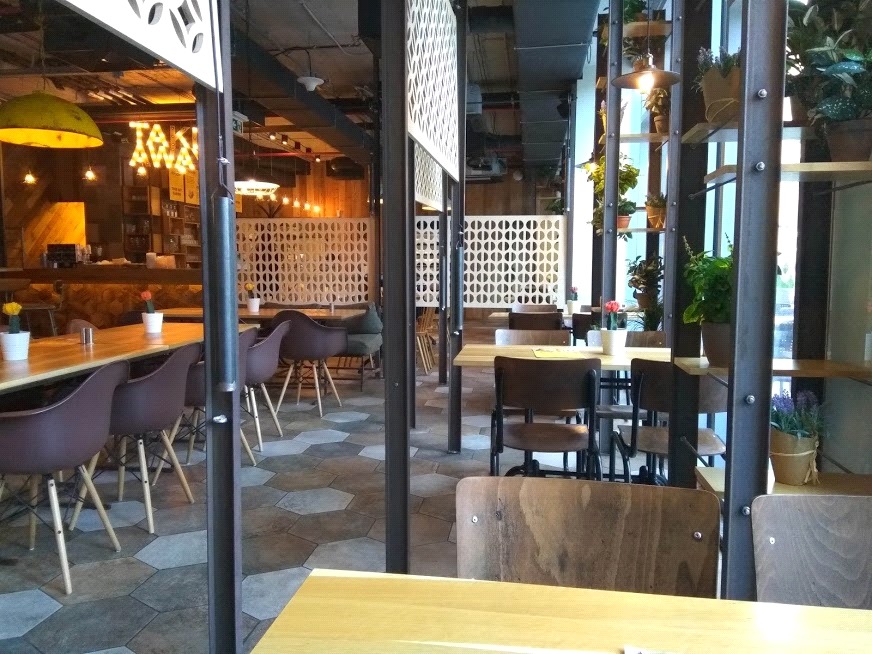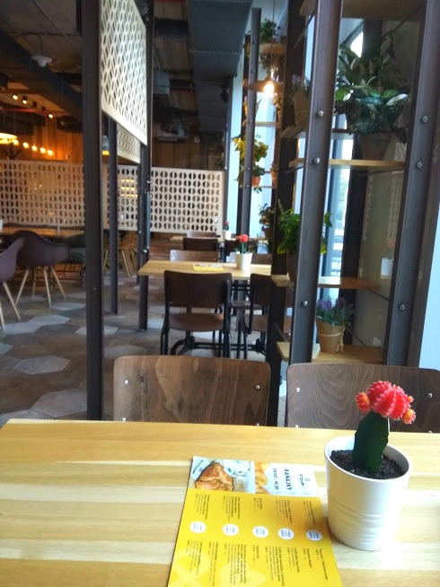 V pozadí hrala tlmená hudba. Ako stvorená na to ráno. Priestor bol opticky predelený do niekoľkých častí. Na výber boli barové stoličky, kreslá aj klasické stoličky. Svetlo bolo viac menej tlmené. Stoly boli v svetlých odtieňoch dreva. Na každom stole bol kaktus. Oceňujem celkovo veľa kvetov v priestoroch reštaurácie. Pôsobila veľmi vydušne a cítila som sa v nej uvoľnene.