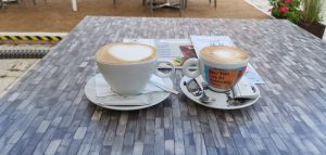 Z danej ponuky sme si vybrali cappuccino malé za 1,80€ a cappuccino veľké za 1,99€. Ako už bolo naznačené, od tejto kaviarne som nemala veľké očakávania. Musím sa priznať, že kávička nás veľmi milo prekvapila. Cappuccino bolo vskutku lahodné. Pripravujú kvalitnú kávu talianskej značky Illy. Spoločnosť Illy začala svoju históriu písať v roku 1933 v Talianskom meste Terst. Spoločnosť Illy vyrába jedinú zmes kávy, ale v troch rôznych stupňoch praženia – normálne praženú, tmavo praženú a bez kofeínu. Zmesi kávy Illy sú vyberané z rôznych odrôd kávy typu Arabica, ktorá má výraznejšiu chuť, ale zároveň menej kofeínu než káva typu Robusta. Cappuccino malé bolo servírované v menšej farebnej šálke s nápisom: „May You Live In Interesting Times.“ Cappuccino veľké bolo servírované v elegantnej bielej šálke. Ku kávičke podávali aj napolitánku. K plnému počtu bodov mi chýbal pohár s vodou. Čašníčka bola ochotná, ale chýbal jej úsmev na tvári. V ponuke majú teplé, alkoholické, nealkoholické a miešané nápoje. Taktiež rôzne ovocné limonády s kúskami ovocia, vybrať ste si mohli ananás, citrus, černice, jahoda, malina, mango, lesná zmes. Ku kávičke si môžete dopriať nejaký zákusok. V konečnom dôsledku sa musím priznať, že Kofein Caffé & Solárium má svoju atmosféru.