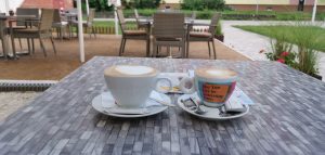 Za svojím obľúbeným nápojom sme nemuseli chodiť ďaleko, pretože Kofein Caffé & Solárium sa nachádza priamo v OC Prior zo zadnej strany budovy. Podotýkam, že kaviarne v obchodných centrách nepatria práve k mojim srdcovým záležitostiam. Do Kofein Caffé & Solárium ma však prilákala predovšetkým pekná letná terasa. Výhľad z tejto terasy síce nebol svetový, ale prisľuboval oddych. Terasa ponúkala výhľad na paneláky a parkovisko, ale vôkol nej bolo dostatok zelene a kvetov. Hneď vedľa Kofein Caffé sa rozprestiera Bar Prior. Navštíviť môžete aj ich ďalšie prevádzky, akými sú: BLUE´S, Coffee Time, Remix Music Club Coffe & Bar, Eden Caffe, Body Speed fitness & Solárium. Ja s obľubou chodím práve do reštaurácie BLUE´S. V kaviarni sa nachádza aj moderné solárium: 2x horizontal – Luxura X7 a 1x vertikal – Luxura V7. Spojiť kaviareň so soláriom považujem za skvelý marketingový trik, ktorý určite do tejto kaviarne pritiahne nejedného zákazníka. Interiér kaviarne som si nemala možnosť popozerať. Napriek mojim prvotným predsudkom sa mi na terase sedelo skvelo.