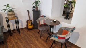 Interiér kaviarne La Caffetteria v Hlohovci je príjemne zariadený v útulnom štýle, ktorý kombinuje moderné a tradičné prvky. Na niektorých miestach sú pohodlné kreslá, ktoré pozývajú na dlhšie posedenie, zatiaľ čo okolo stolov sú rôznofarebné stoličky, ktoré dodávajú priestoru šmrnc. Pri stene sa nachádza dekoratívna gitara, ktorá spolu s rastlinami vytvára domácku atmosféru. Interiér má starobylé oblúkové stropy, ktoré pripomínajú históriu budovy a dodávajú priestoru špecifickú charizmu. Celkový dojem dopĺňajú štýlové dekorácie a jemné osvetlenie, čo robí tento priestor ideálnym na relax pri káve alebo dobrom dezerte. Čo nás však najviac zaujalo, bola ich krásna a pokojná letná terasa. Terasa ukrytá pred zhonom mesta ponúka ideálne miesto na vychutnanie si šálky kávy pod holým nebom. Sediac na čerstvom vzduchu, človek cíti, ako sa čas spomaľuje a život naberá príjemný rytmus. Vôňa kvetov a jemný vánok vytvárajú dokonalé prostredie pre chvíľu oddychu.