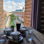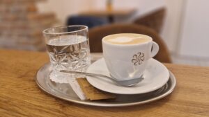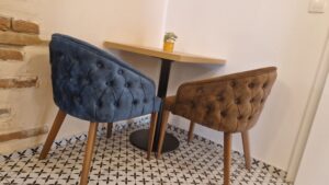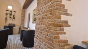 Exteriér tejto kaviarne je veľmi príjemný a útulný. Nachádza sa tu prekrytý priestor s oblúkmi, ktorý vytvára nádhernú atmosféru s dreveným nábytkom, stolmi a stoličkami, kde si návštevníci môžu v pokoji posedieť. Ďalej sa v zadnej časti nachádza aj historická studňa, ktorá je obklopená tehlovým múrom, čím dotvára rustikálny a romantický vzhľad. Táto kombinácia prírodných materiálov a historických prvkov vytvára veľmi príjemné prostredie na relaxáciu. Interiér kaviarne je elegantný a zároveň útulný. Na stoloch sú umiestnené malé dekorácie ako napríklad kvety, ktoré vytvárajú príjemnú atmosféru. Nábytok je v modernom štýle, pričom stoličky majú príjemné zamatové poťahy v rôznych farbách, čo pridáva priestoru na útulnosti a pohodlí. V kaviarni sú použité teplé farby a tehly na stenách, čo dodáva priestoru historický a rustikálny vzhľad. Podlaha má vzorované dlaždice, ktoré dodávajú interiéru estetický a zároveň praktický prvok. Celkovo interiér pôsobí prívetivo a pohodlne.