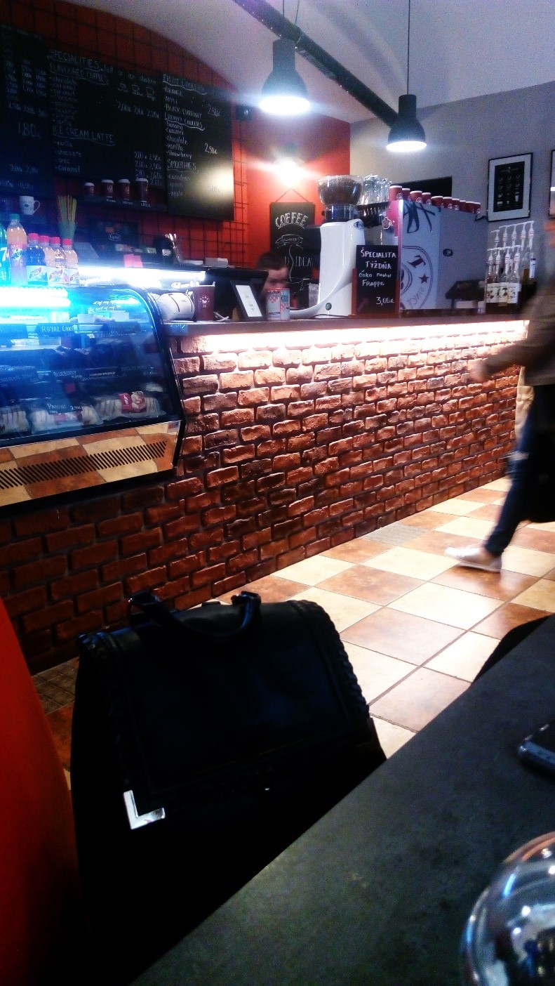 Take it sa snažilo zachytiť mestského ducha a tak tu nájdeme zopár industriálnych prvkov, či už tehly alebo čierne kovové konštrukcie. Dominantná stena je nafarbená výraznou červenou, čo nehodnotím pozitívne – pôsobí príliš agresívne, priestor opticky zmenšuje a evokuje stereotypnú pizzériu. Dlažba takisto nie je nič moc. Obmedzený priestor ponúka len dve posedenia s kapacitou dokopy osem ľudí. Tie takisto pôsobia trochu lacno. Pomyselné plusko si však zaslúžia doplnky, konkrétne tunajšie plagáty s kávami. Interiér má dobrý základ a stačilo by len zopár zmien a kaviareň by sa posunula úplne na inú úroveň.