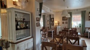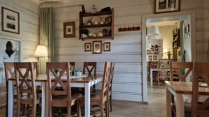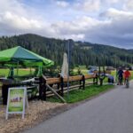 Interiér, ktorý vás okamžite zaujme svojou jemnosťou a eleganciou, dýcha pokojom a príjemnou atmosférou. Steny sú vymaľované v tlmených farbách, ktoré pripomínajú prírodu a tatranskú krajinu, a sú ozdobené jemnými motívmi plesnivca – tradičnej alpskej kvetiny, ktorá dodáva priestoru autentický horský šarm. Dekorácie sú ladené do teplých prírodných tónov, pričom nábytok z masívneho dreva dopĺňa celkovú útulnosť. Veľké okná umožňujú prirodzenému svetlu zaplaviť miestnosť a vytvárať príjemné tlmené osvetlenie. Exteriér reštaurácie neostáva pozadu. Budova je postavená z dreva, ktoré jej dodáva tradičný rustikálny vzhľad a je obklopená nádhernými kvetinovými aranžmánmi. Pred vchodom sa nachádza príjemná terasa s elegantnými stolmi a pohodlnými stoličkami. Kvety a zeleň, ktoré sú starostlivo naaranžované okolo celej budovy, dodávajú tomuto miestu pokoj a prírodnú harmóniu. Vzduchom sa nesie jemná vôňa kvetov a čerstvého vzduchu z okolitých hôr, čo vás okamžite prenesie do tatranskej prírody.