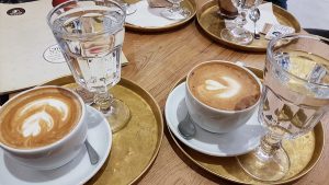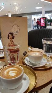 Objednali sme si cappuccino, ktoré bolo síce silné, ale malo lahodnú chuť. Kávu si pražia sami, aby dosiahli 100% čerstvosť pre svojich zákazníkov. Objednávajú len zelenú kávu od svojich poctivých dodávateľov a vždy len v období zberu jednotlivých odrôd. Ak máte naponáhlo, kávu si môžete zobrať aj so sebou, a to v ich štýlovom poháriku. Pripravujú aj rôzne špeciálne kávy s mliečnou, horkou, ale aj bielou čokoládou. Pokiaľ by vám ich kávička zachutila, môžete si zakúpiť aj domov v cene 7,90€ za 250g – ako napríklad Ethiopiu, Dominicu, Sumatru, Braziliu, Tanzaniu, Keňu. Ponúkajú aj výberové pražené lieskovce, mandle, údené mandle, mandle v mliečnej a taktiež v horkej čokoláde. Keďže sú tieto orechy balené v pekných sklených dózach, hodia sa aj ako darček. Dokonca predávajú aj žuvačky bez cukru 10 ks v ich vlastnom balení, celkom zaujímavý nápad. Obsluha bola milá a rýchla. Prekvapila ma ich filozofia, pretože svojim zamestnancom, ktorí v ich prevádzke pracujú aspoň rok, dávajú možnosť otvoriť si svoju vlastnú prevádzku Mondieu. A to beztoho, aby museli platiť astronomické sumy za rozbeh. Dalo by sa teda povedať, že pomáhajú svojim zamestnancom plniť sny. Aj z tohto dôvodu mi je táto kaviareň sympatická a keď sa v najbližšej dobe ocitnem pri niektorej z jej prevádzok, isto ju pôjdem navštíviť.