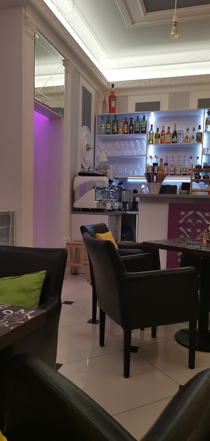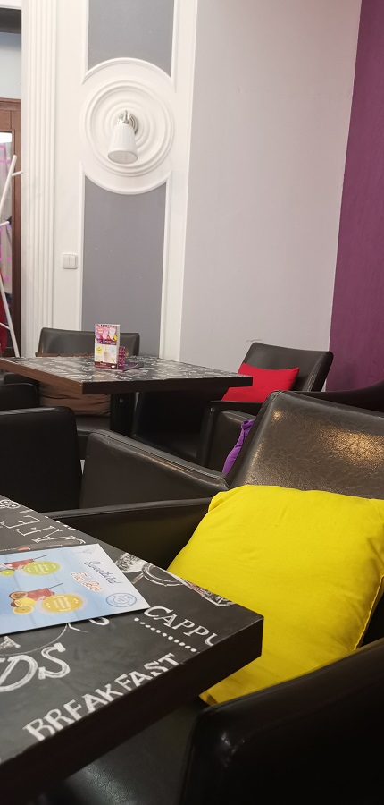Kaviareň Color Caffe sa udomácnila v starej historickej budove. Keď som vošla do miestnosti, zostala som mierne prekvapená alebo, lepšie povedané, zaskočená. Priznávam sa, čakala som niečo úplne iné, niečo diametrálne odlišné od toho, čo tam v skutočnosti bolo. Miestnosť je síce krásna, ale vôbec nebol využitý jej potenciál. Keď si odmyslíte zariadenie, vidíte miestnosť, ktorá dýcha luxusom. Na stropoch je nádherne odvedená štukatérska práca, za ktorú by sa ani jeden majster nemusel hanbiť. Stropy sú naozaj prekrásne vyzdobené. Taktiež steny sú pekne vymaľované v kombinácii bielej a šedej farby a krásne ladia so štukatérskou výzdobou. Žiaľ, nábytok použili taký, aký použili. Tu sa mi do mysle vnára len jedna veta: „Aký mali, taký dali.“ Samozrejme, všetko je to otázka vkusu a možností, ale tu to tak bije do očí, až to človeka mrzí za tú kaviareň. Rázom máte pocit, že ste sa ocitli v nejakom lepšom bare. Možno v inej prevádzke by toto zariadenie pôsobilo dobre. Priestor je členený na dve miestnosti, pričom je jedna väčšia a jedna menšia. Použili tu čierne kožené kreslá a stoly, na ktorých sú nalepené tapety s kávovým motívom. Dokonca na nábytku je bádať zub času. Miestnosť dekorujú farebné vankúšiky a na stoloch nájdete svietniky. Vyzdvihnúť však musím barový pult, ktorý je jednoduchý, ale pôsobí veľmi decentne a to sa mi páči. Aby som nebola len kritická, pekný dojem vo mne zanechalo aj osvetlenie, ktoré pripomína pavúka. Podľa môjho názoru je tu veľký nesúlad medzi miestom, kde je kaviareň vsadená a nábytkom, ktorý do nej použili. Na druhej strane musím poznamenať, že kaviareň disponuje malou, ale vcelku peknou terasou. Nachádzajú sa na nej železné stoličky a stolíky. Na stoličkách sú fialové deky, čo pekne dotvára celkovú atmosféru. Pohodlne usadení na terase so svojím obľúbeným nápojom máte toto námestíčko ako na dani.