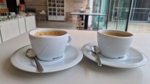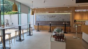 Cestou z kláštora k parkovisku sme natrafili na Omnibus café & foodtruck. Kaviareň sa skrýva na prízemí v modernej betónovej budove. Jedná sa o zaujímavý koncept, pretože sa tam môžete najesť, kúpiť si rôzne darčeky alebo si vypiť šálku kávy. Takže ani neviem povedať, či to je kaviareň, reštaurácia, bistro alebo obchodík so suvenírmi. V každom prípade je skvelé pre turistov mať možnosti stravovania blízko opátstva. Nábytok v interiéri je v štýle bistra (vysoké stoly a stoličky), čo je menej pohodlné na stolovanie. Na terase sú klasické stoly a stoličky. Hneď ako vstúpite do vnútorných priestorov, uvidíte veľký barový pult, taktiež vás upútajú vitríny, skrinky a poličky s rôznymi produktmi. Bistro je ladené v bielo-hnedých odtieňoch. Jedna celá stena je presklená a ponúka tak výhľad na letnú terasu. Podnik je zariadený jednoducho, moderne a príjemne.