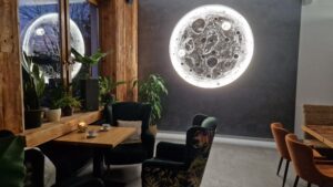 Interiér bol zariadený v jednoduchom, no veľmi štýlovom minimalistickom duchu. Prírodné materiály, ako sú drevo a zeleň, vytvárali harmonickú kombináciu, ktorá upokojuje dušu a navodzuje pocit, akoby ste sa ocitli v oáze pokoja. Najviac nás však uchvátila dominanta priestoru – veľký svietiaci mesiac na jednej zo stien, ktorý pôsobil magicky a dodával miestu nádych mystiky. Mesiac žiaril jemným svetlom, a keď ste sa naň zadívali, mali ste pocit, že vás vtiahne do svojho tajomného sveta. Tento dizajnový prvok bol akoby okno do vesmíru, ktoré robilo z Organily tajuplné miesto. Aj exteriér kaviarne má svoje čaro – ich terasa ponúka výhľad na pokojne tečúci Váh. V lete je to naše obľúbené miesto, kde si sadneme s nápojom a sledujeme ruch na nábreží. No dnes sme si užívali teplo interiéru, kde sa o nás starala veľmi milá obsluha, ktorá nám s úsmevom ponúkla menu.