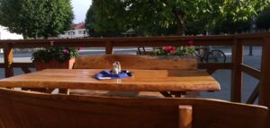 Pri vstupe do Penziónu Dubová vás okamžite zaujme jeho tradičný a útulný interiér. Reštaurácia je zariadená v rustikálnom štýle, so stolmi pokrytými farebnými obrusmi a množstvom dekorácií, ktoré vytvárajú príjemnú domácku atmosféru. Steny sú zdobené zelenými rastlinami a v niektorých častiach sú oblúky prepojené vinicami, čo priestoru dodáva osobitý šarm. Pred vstupom do reštaurácie sa nachádza malá letná terasa, kde sme aj my sedeli. Terasa je zariadená pohodlným vonkajším nábytkom a obklopená zeleňou, čo poskytuje príjemné prostredie na posedenie vonku počas teplých dní. Z terasy je nádherný výhľad na historickú radnicu, čo ešte viac umocňuje celkový zážitok.
