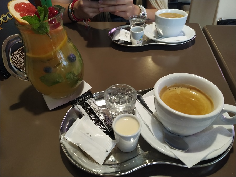 Po pár minútach sme mali pred sebou našu objednávku. Osobne som si objednala Espresso s mliekom, ktoré som dostala klasicky na striebornom podnose spolu s keksíkom a cukrom. Ako druhé som si objednala mandarínkovú limonádu. Čo sa týka kávy, bola veľmi chutná. Nebola horká a bola primerane silná, tak ako správne Espresso. Čo sa týka limonády, bola som z nej sklamaná. Objednala som si mandarínkovú limonádu ale žiadnu mandarínku som v nej žiaľ nenašla. Zato som tam našla pomaranč, grep alebo čučoriedky. Nemala dokonca ani chuť po mandarínkach, vlastne ani nemala mať z čoho. Zhodnotím to tak, že celá limonáda chutila ako voda zo sirupom.