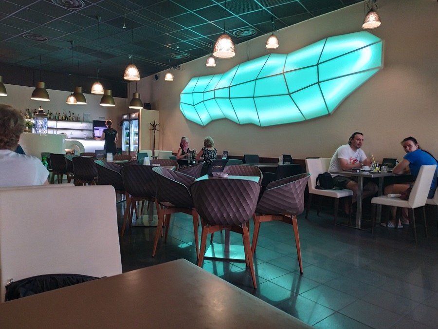 Interiér kaviarne ponúkal posedenie na kožených sedačkách popri stenách a v strede sa nachádzali dizajnové stoličky tmavej farby. Bar bol na konci kaviarne. Bol celý biely a nakoľko zvyšný nábytok bol zväčša tmavej farby, dokonale bol viditeľný a výborne sa hodil do celkového vzhľadu kaviarne. Veľmi sa mi páčilo decentné osvetlenie, ktoré sa skladalo z visiacich lustrov, ktoré viseli z čierneho stropu. Nemôžem zabudnúť na veľkú svietiacu dekoráciu, ktorá vystupovala zo steny. Neviem presne čo to bolo alebo čo to malo znázorňovať, ale veľmi sa mi to páčilo. Oživilo to celú miestnosť a rovnako aj atmosféru.