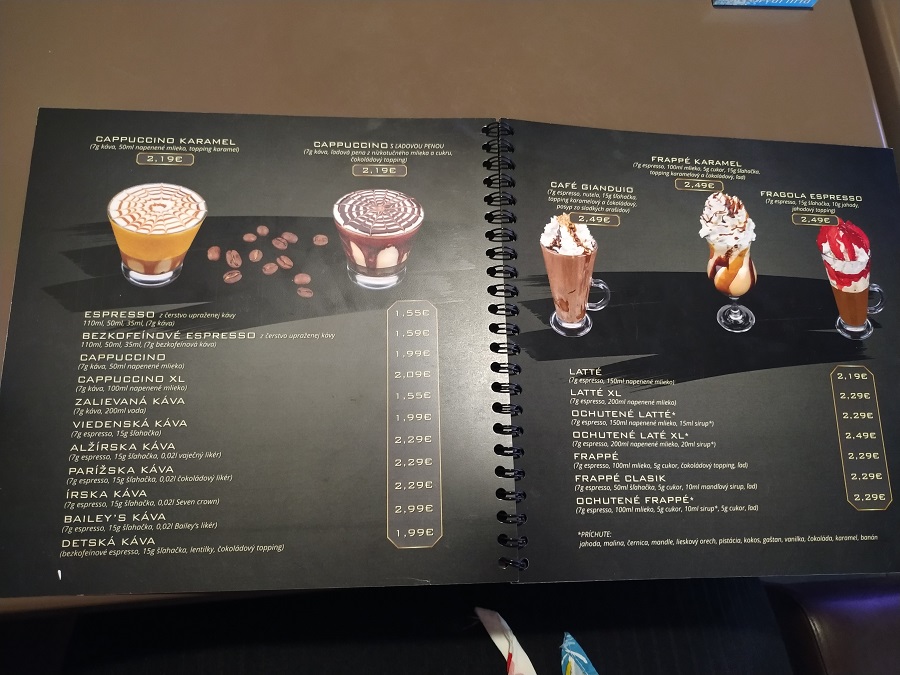 Nápojový lístok bol na každom stole, rovnako ako popolník, nakoľko sme boli vo fajčiarskej miestnosti. Nápojový lístok bol v tvare notesa čiernej farby so zlatým názvom kaviarne a s obrysom tvárí. Vnútro nápojového lístka bol rovnako čiernej farby so zlatým písmom, spolu niektorými ilustráciami ponuky nápojov.