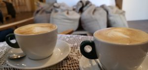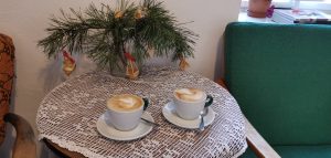 Vychutnávali sme si túto unikátnu chuť cappuccina a vtom prišli ďalší hostia. Predpokladám, že sa jednalo o pár. Pán z tejto dvojice bol celkom zhovorčivý a pustil sa do komunikácie s čašníkom. Nakoľko je priestor maličký, vypočuli sme si aj my ich rozhovor a dozvedeli sme sa kopec zaujímavých informácií ohľadom kávy, jej praženia a podobne. Dokonca nám čašník ukázal aj ako vyzerajú zelené kávové zrná, ktoré sa nachádzali vo vreciach. Niežeby som to nikdy predtým nevidela, ale páčila sa mi čašníkova ochota a ústretovosť. Bol vskutku veľmi milý a bolo vidieť, že sa svojej práci výborne rozumie. Samozrejme, do rozhovoru sme sa zapojili aj my. Vďaka tomuto rozhovoru som sa dozvedela, že cappuccino, ktoré nám bolo servírované, bolo pripravené zo zmesi viacerých káv pomere 80% Arabica a 20% Robusta. Samozrejme, nám aj dané druhy káv vymenoval, ale, žiaľ, som si ich nezapamätala. Naozaj musím uznať, že toto cappuccino bolo geniálne. Táto skvelá kávička spojená s prezentáciou v nás zanechala úžasný zážitok. Priznávam sa, že trochu ma predsa len mrzí, že sme sa počas celého pobytu V Českom Krumlove do Café Synagóga už nedostali, ale pražiareň IDEÁL bola adekvátnou náplasťou.