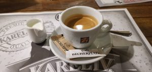 V reštaurácii Karel IV. ponúkajú každý pracovný deň obedové menu. Taktiež pripravujú niečo dobré k pivu, polievky, studené a teplé predkrmy, špeciality z grilu, českú klasiku, minútkové jedlá, ryby, šaláty. Každý deň ponúkajú široký výber zmrzlín a dezertov od vlastnej cukrárky. Samozrejmosťou je bohatá ponuka pív z Pivovaru Karla IV. V ponuke majú aj alkoholické, nealkoholické a kávové nápoje, destiláty, víno a veľa iného. Musím oceniť veľmi milý a ochotný personál. Čašníkovi, ktorý nás obsluhoval, nechýbal úsmev na tvári. Objednali sme si obedové menu, ktoré bolo mimochodom vynikajúce. Jedlo bolo nielen chutné, ale aj krásne naservírované. A k obedu nesmel chýbať zlatistý mok – Karol IV. svetlý 11° a šálka voňavej kávy. Z kávovej ponuky sme si vybrali Espresso Lungo s mliekom za 42Kč. Ako sami vidíte, ceny v reštaurácii boli naozaj ľudové. Kávu pripravujú značky Zicaffé. Káva bola lahodná. Ako už bolo spomenuté, súčasťou reštaurácie je malý pivovar. Pivovar Karel IV. produkuje: