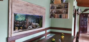Interiér reštaurácie je zariadený v rustikálnom štýle, kde prevláda drevo a príjemné teplé farby. Na stenách nájdete množstvo obrazov a fotografií, ktoré dodávajú priestoru osobitý a domácky ráz. Pohodlné drevené stoly a stoličky sú vybavené mäkkými poduškami, ktoré zabezpečujú komfort počas celého vášho pobytu. Jedným z najväčších lákadiel interiéru je veľké akvárium zabudované do steny, ktoré je plné farebných rýb a prírodných dekorácií. Vedľa akvária nájdete poličky s rôznymi dekoračnými predmetmi a knihami, čo len umocňuje útulnú atmosféru reštaurácie. Exteriér reštaurácie je rovnako pôsobivý. Krytá terasa ponúka nádherný výhľad na priľahlý rybník, kde môžete sledovať pohyb vody a počúvať spev vtákov. Terasa je vybavená drevenými lavicami a lavičkami, ktoré sú ideálne na dlhé posedenie pri jedle alebo nápoji. Okolitá zeleň a príjemné prostredie vytvárajú dokonalú oázu pokoja a relaxu.