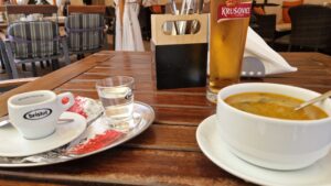 Čo sa týka ponuky reštaurácie, menu zahŕňalo špeciality slovenskej kuchyne doplnené o domáce recepty, ktoré nám odporučila obsluha. My sme sa rozhodli pre denné menu. K tomu sme si dali espresso, ktoré bolo servírované s vodou, tak ako to má byť pri správnom podávaní kávy. Značka kávy, ktorú používajú, je Bristot – talianska značka, ktorá má dlhoročnú tradíciu už od roku 1919. Bristot je známa svojou výnimočnou kvalitou a bohatou chuťou, ktorá je kombináciou najlepších kávových zŕn z rôznych častí sveta. Káva mala jemnú a zároveň intenzívnu chuť s príjemnou arómou, ktorá nás doslova preniesla do talianskych kaviarní. Espresso bolo servírované v elegantnej šálke, čo ešte viac umocnilo celkový dojem. Obsluha bola prívetivá a ochotná. Vždy nám boli k dispozícii, no zároveň nám poskytli dostatok súkromia na to, aby sme si mohli vychutnať naše jedlo a rozhovor. Naše popoludnie v Reštaurácii a Café Jaskyňa bolo skvelým zážitkom, ktorý nás nielen nasýtil, ale aj potešil svojou jedinečnou atmosférou a výbornou kuchyňou. Ak budete niekedy v Košiciach, určite sa oplatí toto miesto navštíviť, či už na lahodný obed, romantickú večeru alebo len na šálku kvalitnej kávy. Táto reštaurácia vás príjemne prekvapí.