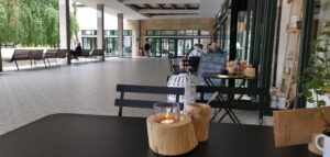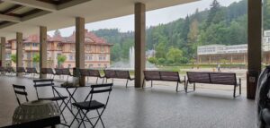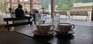 Pri našej návšteve sme sa usadili na terase, ktorá je elegantne zariadená moderným nábytkom a doplnená o vkusné dekorácie. Či už ide o jemné kvetinové aranžmány alebo dizajnové doplnky, terasa pôsobí veľmi príjemným a pohodlným dojmom. Hoci počas našej návštevy pršalo, v kaviarni, ktorá je ukrytá pod kúpeľnou kolonádou, sa nám sedelo úžasne. Príjemná atmosféra, vôňa čerstvo pripravenej kávy a krásne scenérie nás úplne pohltili. Obsluha bola milá a profesionálna, vždy pripravená splniť naše želania a zabezpečiť, aby sme sa cítili ako doma.