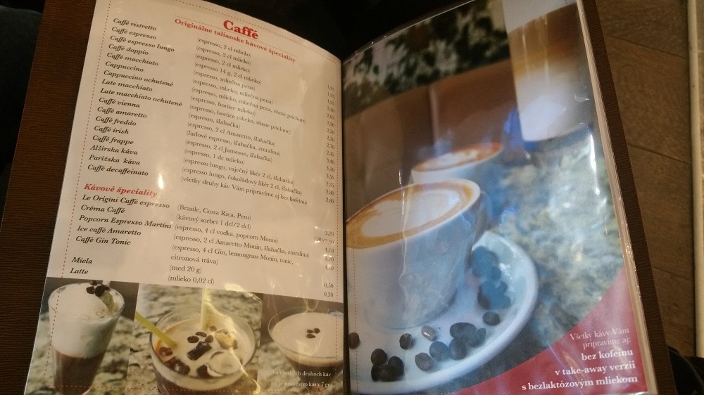 Ponukový lístok bol jednoduchý ale zároveň elegantný. Pozostával z koženého obalu a bielych strán. Kaviareň ponúka mnoho rôznych káv talianskej značky Segafredo, ktorá vyniká silnými korenenými tónmi, spojenými s hustou penou a celkovo plnou chuťou a mierne horkým zakončením. Na Bratislavu a na to, že sme sa nachádzali v nákupnom centre, hodnotím ceny kaviarne prípustne.