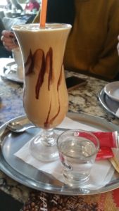 Čo sa jedná kávy, testovali sme Caffé frappe. Na kávu sme nečakali dlho. Na klasickom podnose „pristála“ predo mnou krásne pripravené frappe spolu so základnými ingredienciami ako je voda, cukor či keksík. Frappe bolo chuťovo veľmi dobré a jemne horkasté. Pena bola príjemne hustá. Priatelia boli so svojím výberom espressa a horúcej čokolády taktiež veľmi spokojný.