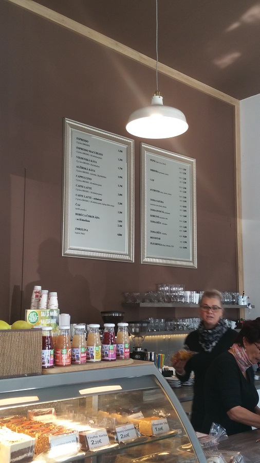Tak sme sa postavili do radu. Nad barom boli dve tabule, na ktorej bola ponuka kaviarne. Neviem čo by sa stalo, keby bol nápojový lístok na každom stole. Obslúžila nás celkom milá čašníčka, ale po tom, ako sme jej oznámili že chceme len kávu tak na nás pozrela či len kávu a že či tu na mieste. Prišlo mi ta ako keby povedala, že či to myslíme vážne si dať len kávu.