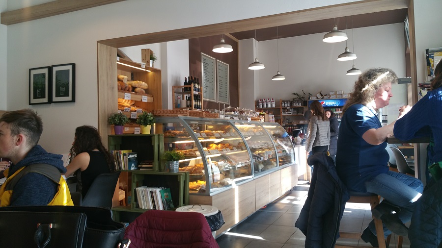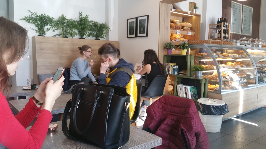 S radosťou som vošla do vnútra s pocitom, že som v tej kaviarni ktorú opisovala spolubývajúca. Ale už na prvý dojem sa mi dajako nepozdávala. Vošli sme dovnútra. Personál sa nám vôbec nepozdravil. Ako prvé nás oslovil obrovský bar, kde boli prevažne koláče a rôzne pekárenské výrobky.