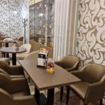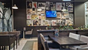 Interiér kaviarne Sweeteria je priam stvorený na oddych a relax. Pôsobí ako dokonalé spojenie moderného štýlu s príjemnou útulnosťou. Tmavé steny v kombinácii s dekoratívnymi prvkami dodávajú priestoru eleganciu a hĺbku, no zároveň ho nerobia chladným či neosobným. Na stenách visia desiatky zarámovaných fotografií a obrázkov, ktoré zachytávajú lákavé zákusky, čokoládové torty a šálky kávy, akoby z nich už na pohľad stúpala príjemná vôňa. Táto galéria obrazov dodáva miestu osobitosť a hravý šarm. Veľké sklenené okná, ktoré lemujú časť priestoru, vpúšťajú dnu dostatok svetla a ponúkajú výhľad na pulzujúci život v obchodnom centre. Zároveň však nevytvárajú rušivý kontrast; naopak, človek má pocit, že je súčasťou diania a predsa v inom, pokojnejšom svete. Jemné industriálne lampy visia zo stropu a ich teplý lesk osvetľuje každý kút kaviarne, pričom vytvárajú príjemnú a takmer domácku atmosféru. Pohodlné kreslá a gauče, na ktorých sa tak dobre sedí, akoby priam volali: „Sadni si, spomaľ a uži si túto chvíľu.“