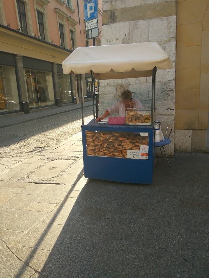 Doslova na každom kroku dostanete v pouličných stánkoch obwarzanky, čerstvé praclíky posypané makom, soľou alebo sezamom.