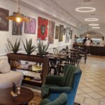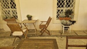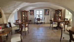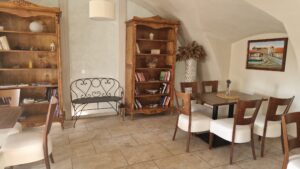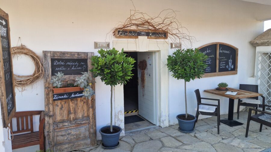 Exteriér kaviarne vás privíta rustikálnymi dekoráciami – starými drevenými dverami, kvetináčmi s bujnou zeleňou a tabuľkami s nápismi, ktoré lákajú na kávu či dezert. Vonkajšie posedenie na terase ponúka výhľad na zámocké prostredie a je dokonalým miestom na slnečné popoludnia. Interiér kaviarne si zachoval historický nádych. Klenuté stropy, kamenné podlahy a drevený nábytok vytvárajú útulnú a elegantnú atmosféru. Na stenách visia obrazy a police plné kníh, ktoré pridávajú na domáckom dojme. Každý detail je starostlivo premyslený tak, aby ste sa tu cítili ako v inom svete – svete pokoja a estetiky.